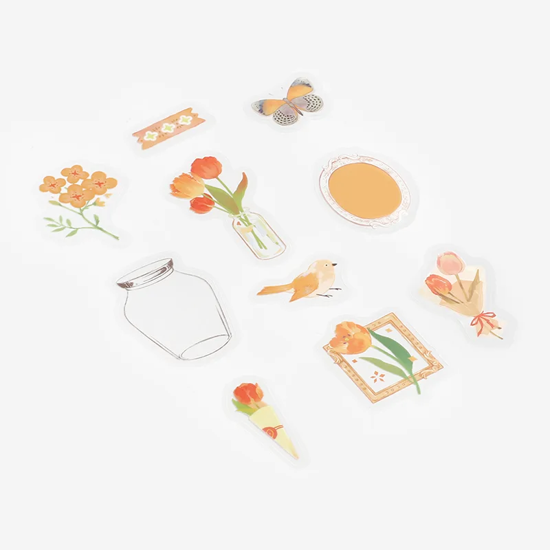 Looking to start your scrapbooking journey? This beginner-friendly flake sticker pack is the perfect starter kit for scrapbook lovers! Featuring a botanical and floral theme, the set includes transparent die-cut stickers with charming elements like vases, mirrors, flowers, wreaths, and vintage-style frames.