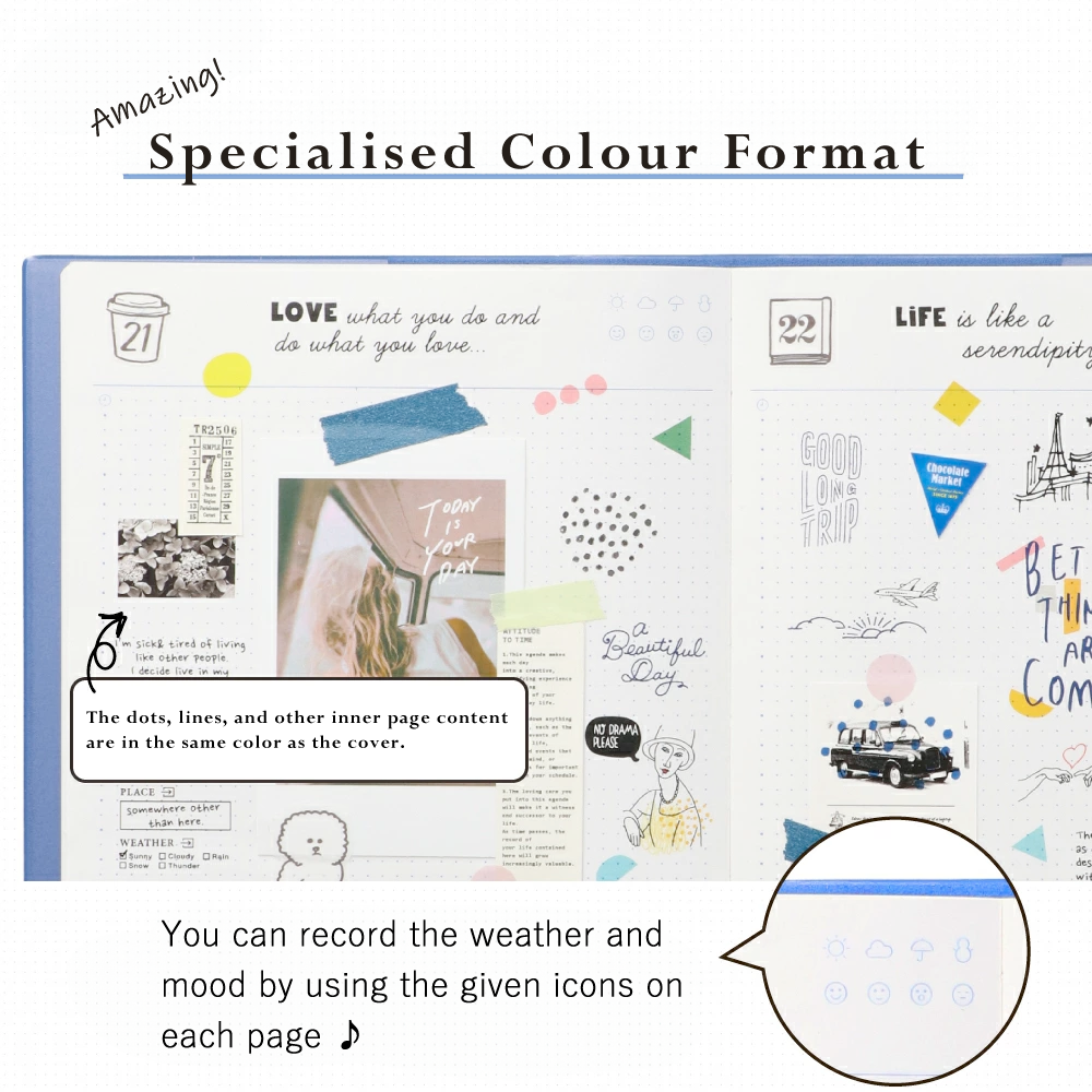 This undated daily diary gives you the flexibility to start anytime—no pressure, no wasted pages! Each page features mood and weather icons so you can quickly record down how you’re feeling and what your day looked like.
